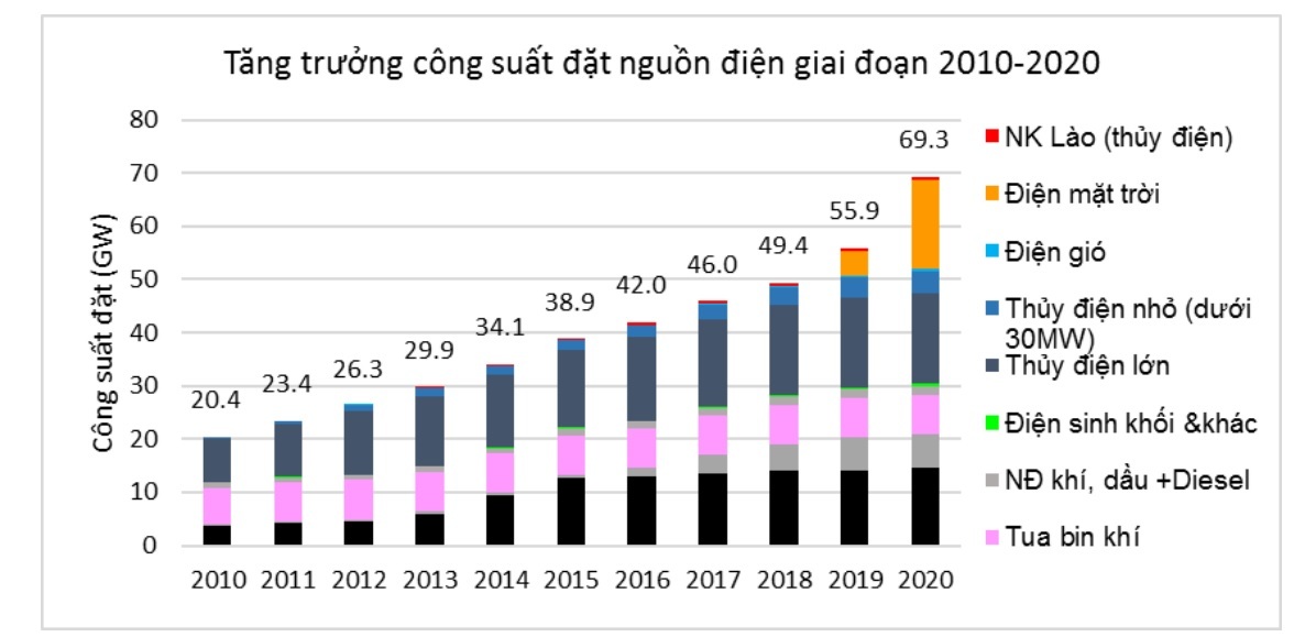 Bên cạnh các nguồn truyền thống, nguồn điện mặt trời và điện mặt trời áp mái cũng có sự tăng trưởng đột ngột trong các năm 2019-2020. Từ mức không đáng kể đầu năm 2018, công suất điện mặt trời (bao gồm điện mặt trời áp mái) đã đạt 4.700MW cuối 2019 và 16.700MW cuối năm 2020. Hiện tại, cơ cấu của nguồn năng lượng tái tạo biến đổi (gió và mặt trời) đã chiếm gần 26% tổng công suất đặt của nguồn điện. Nhiệt điện khí và dầu hầu như không phát triển mới trong suốt giai đoạn 2011-2020.